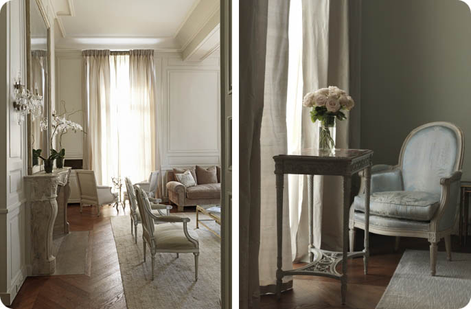 Place des Vosges - Paris This flat in Paris is in famous Places des Vosges...Love the natural colours of this living room.....so classy...I think that placing these outdoor forniture in the kitchen is a brilliant idea!All images: here